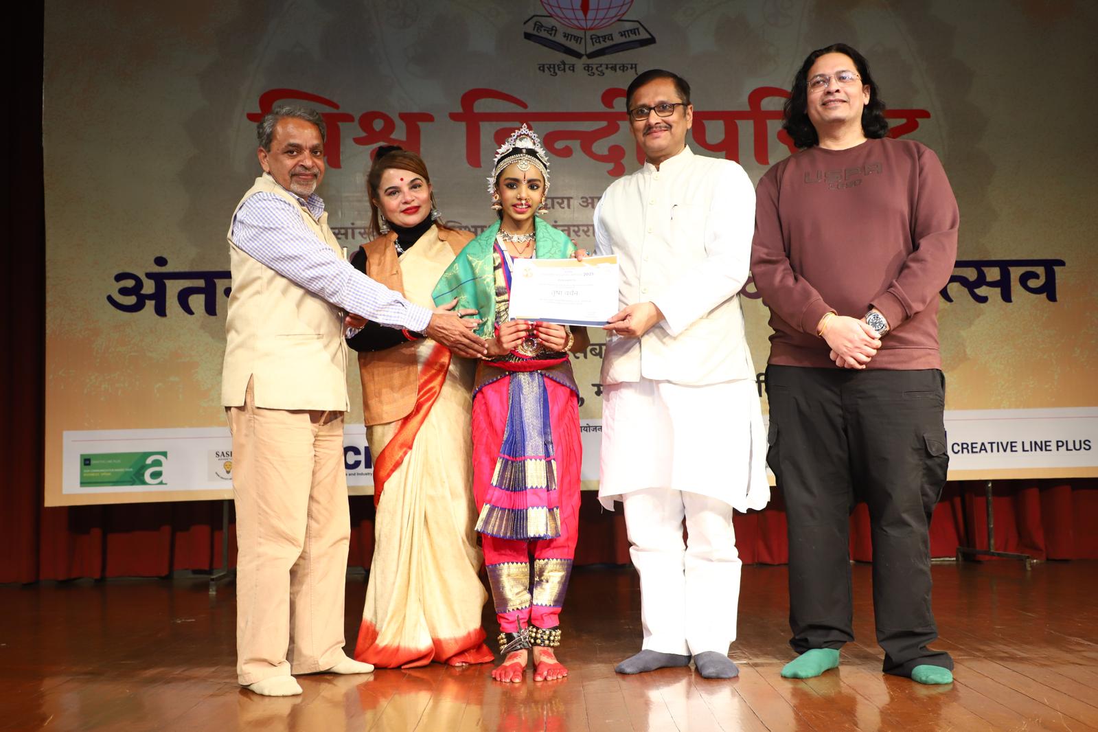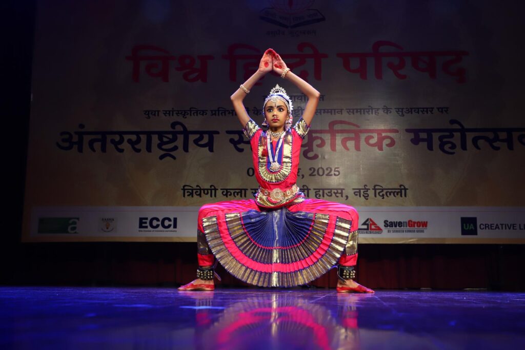 At the International Cultural Festival organized by the Vishwa Hindi Parishad at Triveni Kala Sangam, Mandi House, New Delhi, young artists from India and abroad made the event memorable with their excellent performances. Among them, the performance of Trisha Vardhan, a renowned Bharatanatyam dancer and Hindustani classical singer from California, USA, was a special attraction. The audience gave her a standing ovation for her graceful movements and expressive artistry.