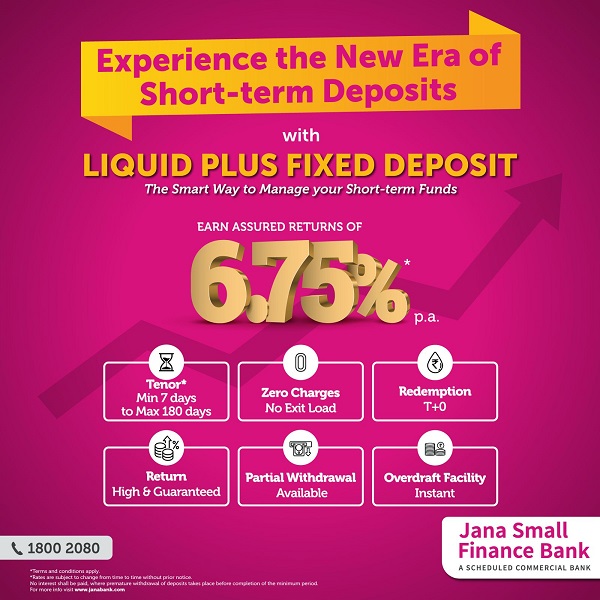 Jana Small Finance Bank, one of India’s leading small finance banks, today announced the launch of a comprehensive solution “Liquid Plus” Fixed Deposit with attractive interest rate of 6.75% p.a. for tenures ranging from 7 to 180 days. The rate is applicable for the minimum deposit amount of INR 10 Lakhs for retail deposits up to INR 3 Crores and above INR 3 Crores to INR 200 Crores for bulk deposits per customer. The liquid plus fixed deposit makes short term deployment of funds extremely easy and attractive with higher returns. The Bank has taken this step based on the feedback from customers seeking placement of short term funds.