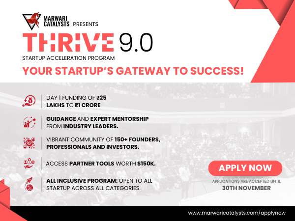 Marwari Catalysts is excited to announce the opening of applications for Thrive 9.0, the latest batch of its successful acceleration and funding program. This 9th cohort builds on the achievements of the previous 8 successful batches, aiming to empower early-stage startups across all sectors with essential resources, mentorship, and funding opportunities to elevate their growth and entrepreneurial journey.